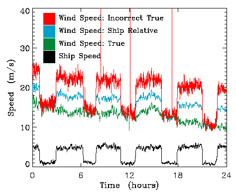 Fig. 1. Example of accurate true wind calculation (green) vs. incorrect calculation (red) for the R/V Knorr. Note that both the platform-relative wind (blue) and the incorrect true wind have a signal of the ship's Earth-relative speed (black).