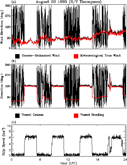 Fig. 3. Time series plots of (a) course-estimated (black) vs. meteorological true (red) wind direction, (b) vessel course (black) vs. heading (red), and (c) vessel speed over the ground from the R/V Thompson (03 August 1993).