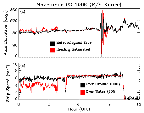 Fig. 5. Time series plots of (a) heading-estimated (red) vs. meteorological true (black) wind direction and (b) vessel speed over the water (red) vs. the speed over the ground (black) from the R/V Knorr (02 November 1996). Note that the speed over the water drops out after 10:30 UTC due to an instrument malfunction.