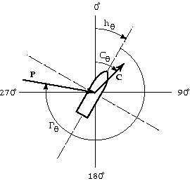 (direction from which wind is blowing) | vector | P | zero reference on ship | ship |